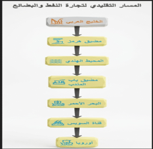 يوضح التصميم مسار حركة التجارة بدءاً من منطقة الخليج العربي وصولاً إلى أوروبا مروراً بمضيقي (هرمز وباب المندب).