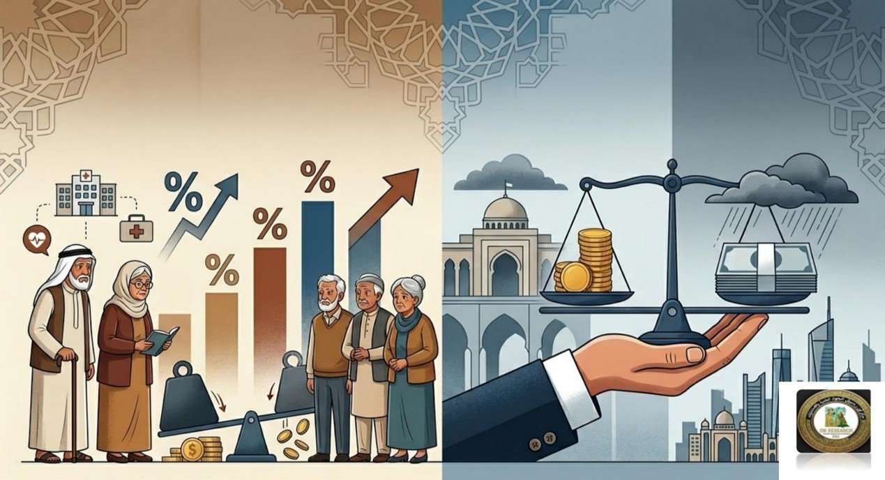 يمتاز التحول الديموغرافي العربي بخاصية نادرة تتمثل في تزامن بقايا الزيادة الطبيعية مع بدايات الشيخوخة، مما يُفرز ضغطاً مزدوجاً على الميزانيات: الاستمرار في الإنفاق على فئات الشباب من جهة، وتمويل احتياجات المسنين من جهة أخرى. وقد وصف بعض الاقتصاديين هذا الوضع بـ “مقص الإنفاق الديموغرافي” (Demographic Spending Scissors)، إذ تتشابك الضغوط الإنفاقية لفئتين عمريتين متناقضتين في آنٍ واحد.