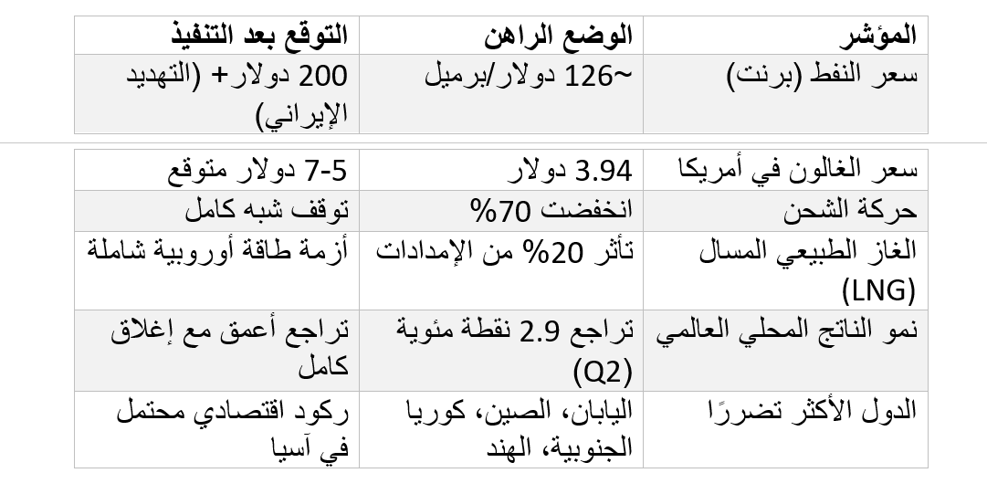 4- على الصين وآسيا: الصين (تستورد 80-90% من احتياجاتها النفطية عبر هرمز، بما في ذلك النفط الإيراني) ستعاني أكثر: انقطاع يصل إلى 5 ملايين برميل يوميًا، ارتفاع أسعار الطاقة والسماد (اليوريا الخليجية)، واضطراب سلاسل التوريد الصناعية. الهند واليابان وكوريا الجنوبية (تعتمد 60-80% على الخليج) تواجه نقص وقود وكهرباء وتأثيرًا على الزراعة. الصين قد تضغط دبلوماسيًا على طهران لتجنب الخسائر، أو تسرع انتقالها إلى الطاقة الخضراء، لكن الضرر الفوري سيكون هائلًا (خسائر تصدير تصل إلى 1.2 تريليون دولار في حال إغلاق طويل).
