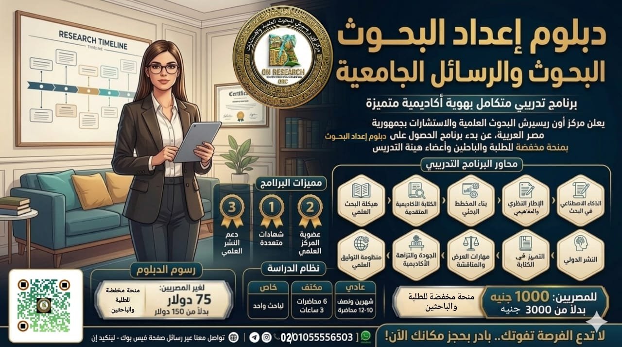 (دبلوم إعداد البحوث والرسائل الجامعية )، وهو برنامج تدريبى يهدف إلى تزويد المشاركين بالمهارات الأكاديمية اللازمة لإجراء البحوث العلمية ، بدءاً من اختيار العنوان وصياغة الإشكالية، مروراً بمنهجيات البحث وجمع البيانات وتحليلها، وصولاً إلى كتابة وتوثيق البحوث وصياغة الخاتمة ومناقشة النتائج والتوصيات .